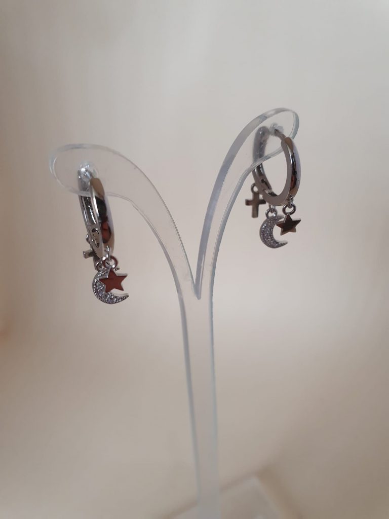 Aretas con estrella, luna y cruz cyma hace 4 años Aretas de plata de Promojoya con estrella, luna y cruz.