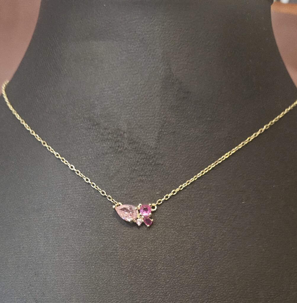Colgante de plata chapada en oro con piedras rosas cyma hace 2 meses Colgante de plata chapada en oro con piedras rosas. La cadena es de 40 cm