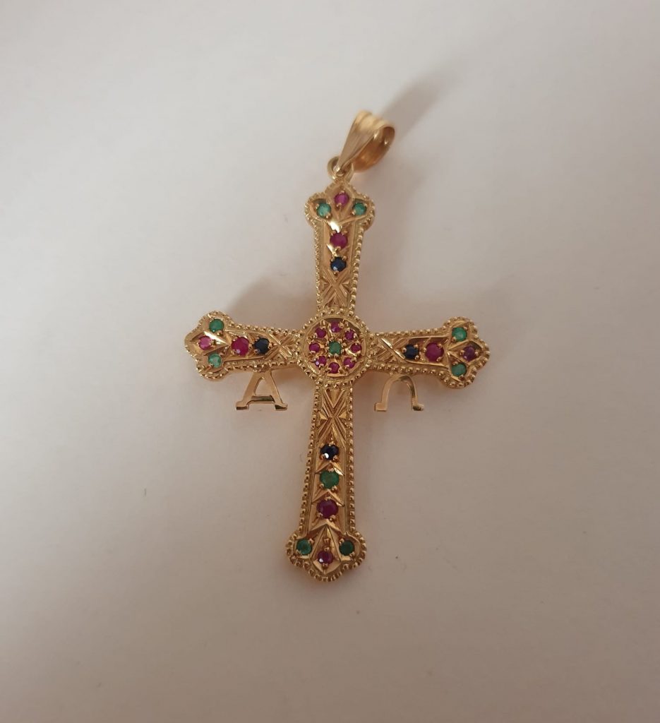 Cruz de Asturias o de la Victoria en oro. Mide 50 mm. Tiene unos cuantos zafiros, esmeraldas y rubies. Lleva el alpha y el omega