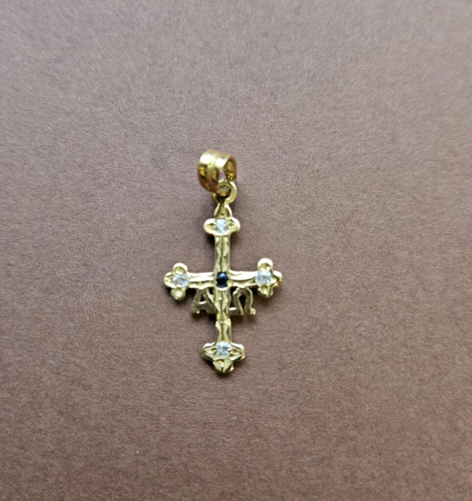 Cruz de Asturias en oro de 18kt con zafiro. Tiene unas medidas de 23 mm de alto y 14 mm de ancho sin contar la reasa
