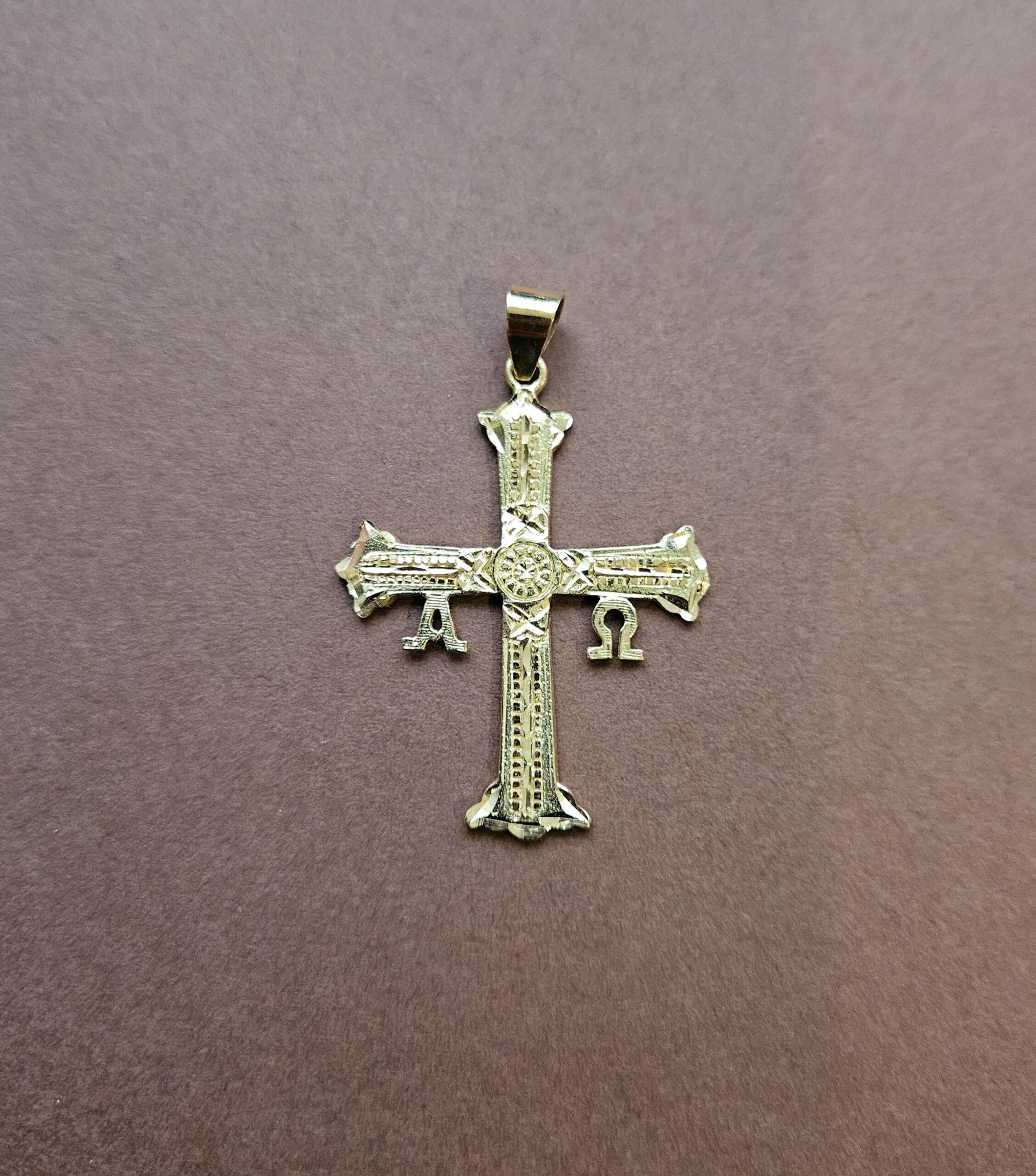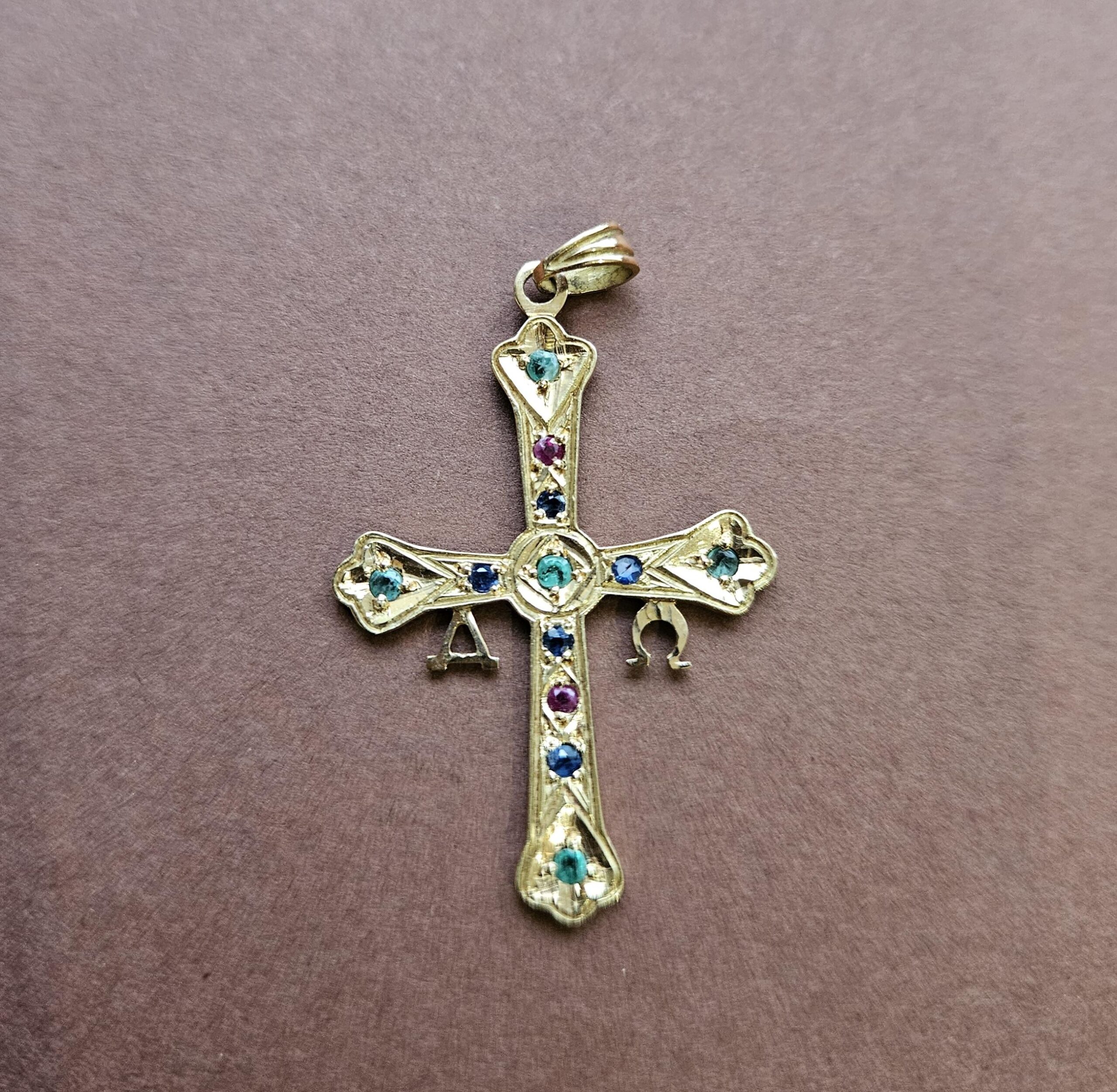 Cruz de Asturias mediana de oro 18 kt con esmeraldas, zafiros, rubíes y circonitas. Las medidas son : 37 mm de alto por 26 mm de ancho sin contar la reasa