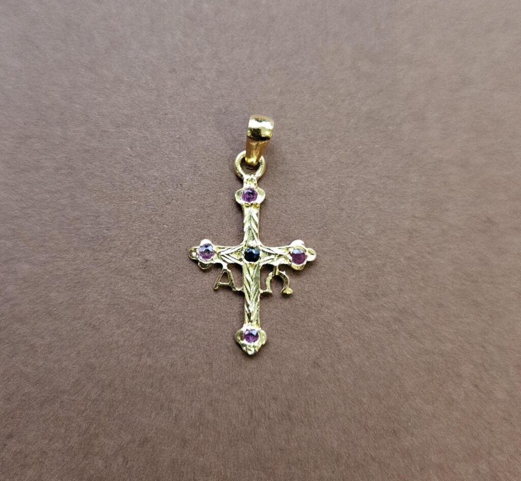 Cruz de Asturias pequeña en oro de 18kt con rubíes y un zafiro. Las medidas son : 21mm de alto por 16mm de ancho