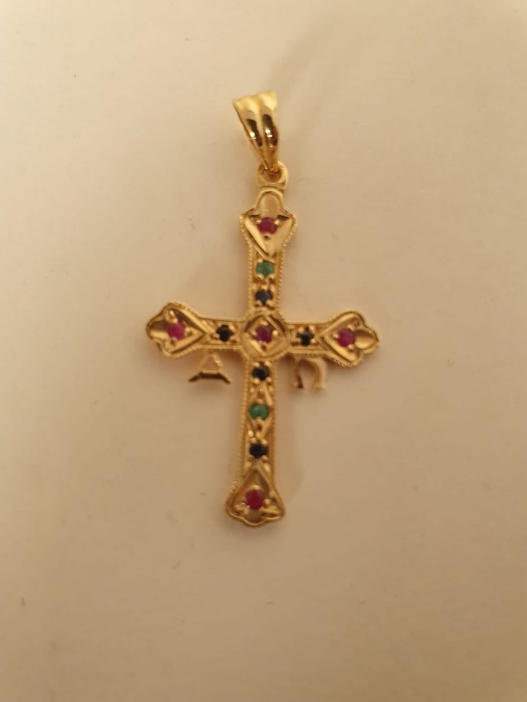 Cruz de Asturias cyma hace 4 años Cruz de Asturias en oro con rubies, esmeraldas y zafiros. Mide 30mm de largo y lleva el alpha y el omega.