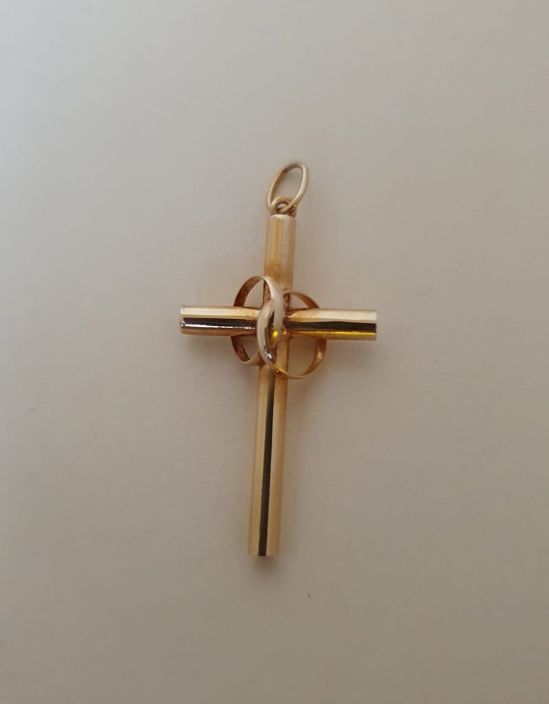 Cruz de oro mediana con dos aros entrelazados.