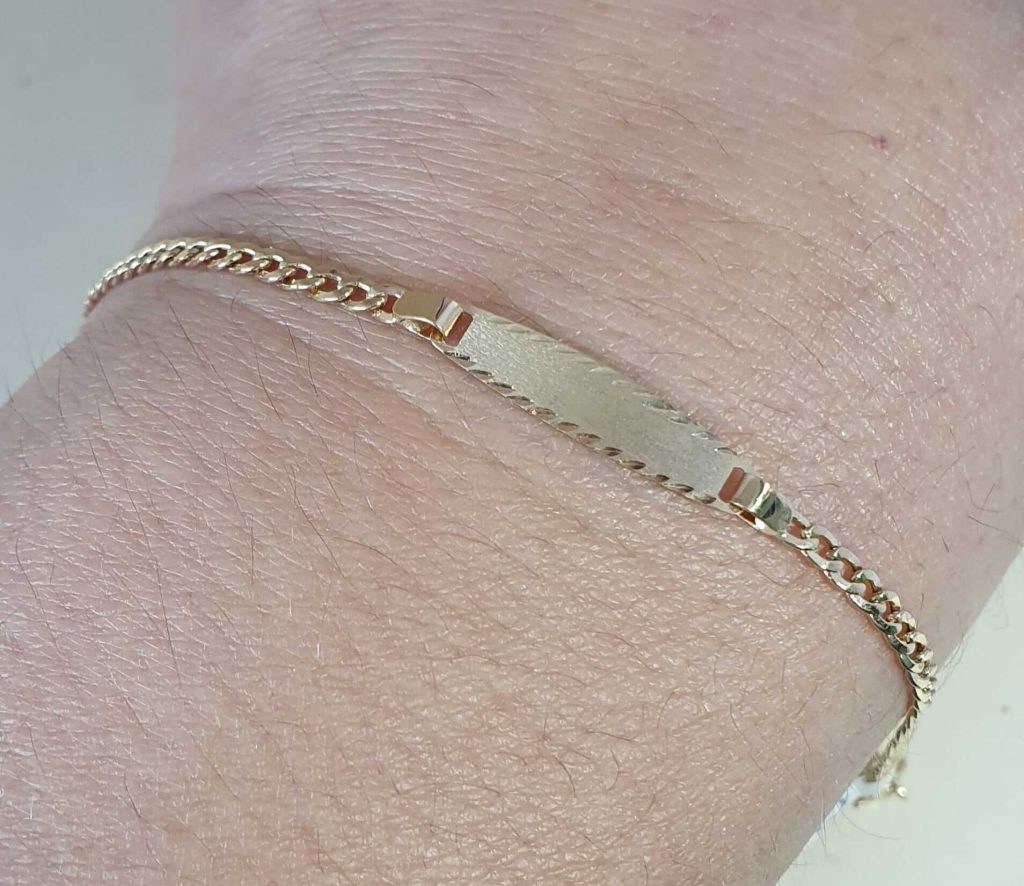 Esclava de bebe con cadena forzada cyma hace 4 años Esclava de bebe en oro amarillo con chapa clásica y cadena forzada. Mide 12 cm.