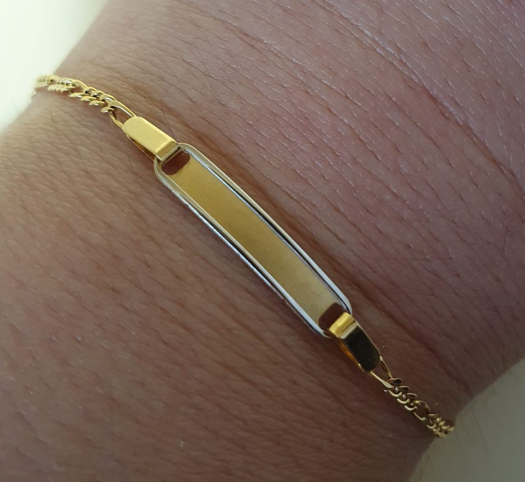 Esclava de bebe en oro con la chapa matizada y rodeada de oro blanco. La enviamos grabada con lo que queráis poner sin coste adicional.