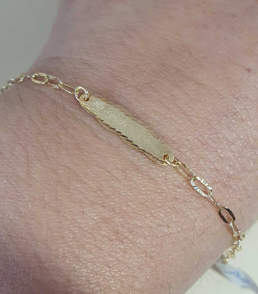 Esclava de bebe de oro con cadena barbada abierta. Mide 13 cm
