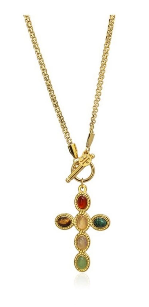 Gargantilla con cruz de Anartxy cyma hace 4 años Gargantilla con cruz de Anartxy de acero dorado con piedras de colores y cierre de palanca.