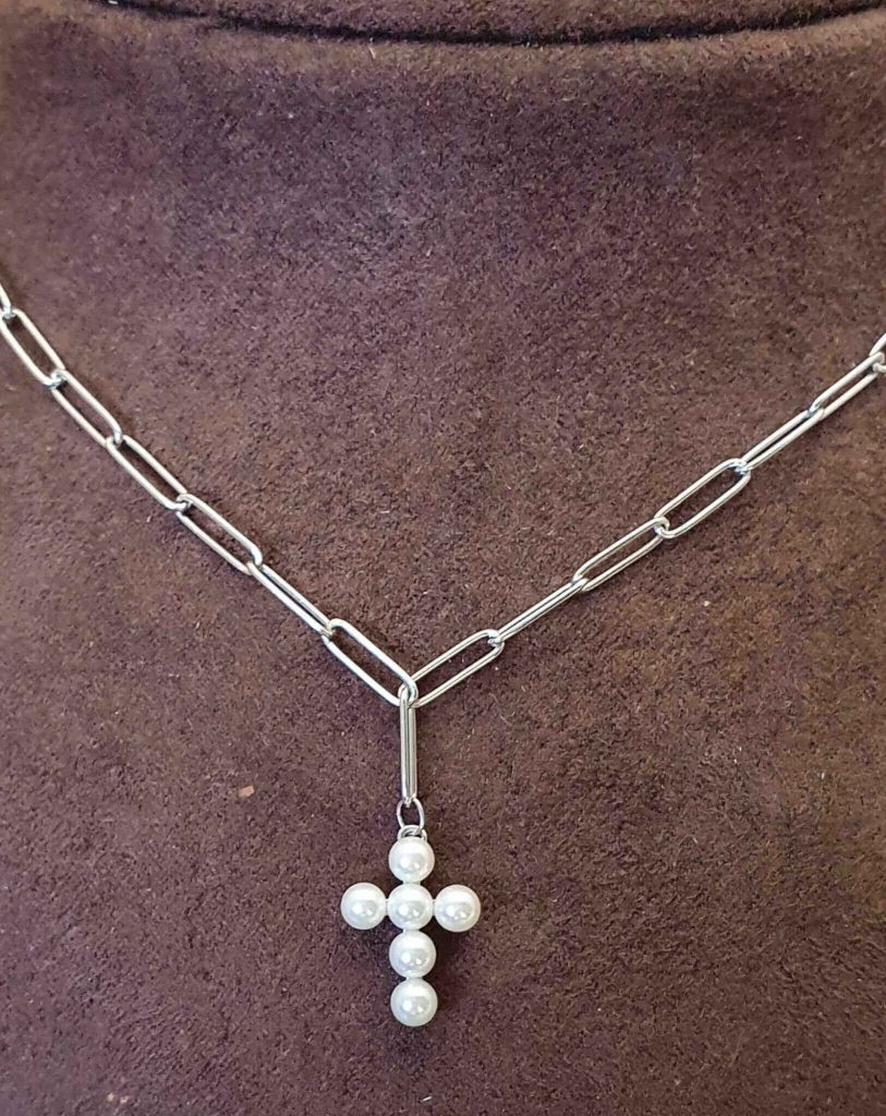 Gargantilla de plata con cruz cyma hace 4 años Gargantilla de plata con perla. La gargantilla es de eslabón ancho y la cruz esta rellena de perlas.