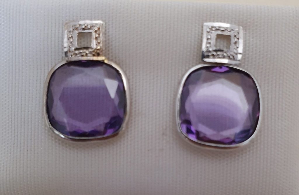Pendientes de oro blanco con amatista cyma hace 4 años Pendientes cortos de oro blanco con circonitas por la parte de arriba y una amatista.