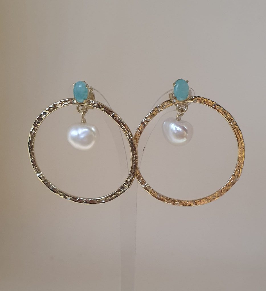 Pendientes de plata chapada de Top Silver en forma de círculo con una calcedonia y una perla. El cierre es de presión