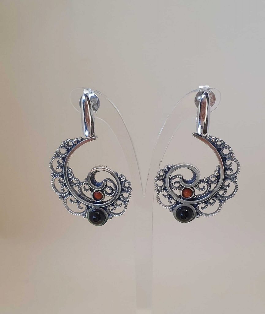 Pendientes de plata de Fink Orfebres con azabache y coral en forma de coma más redondeada. El cierre es de presión