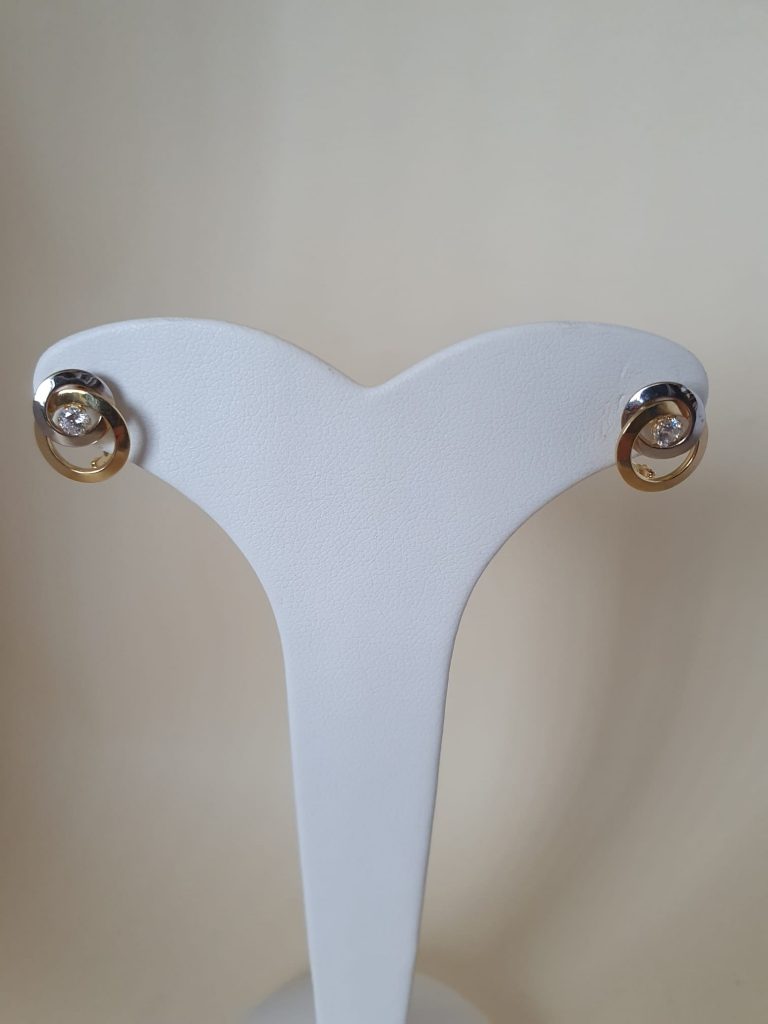 Pendientes que se componen de dos circulos, uno de oro blanco y el otro de oro amarillo y en el medio una circonita. Llevan cierre catalán