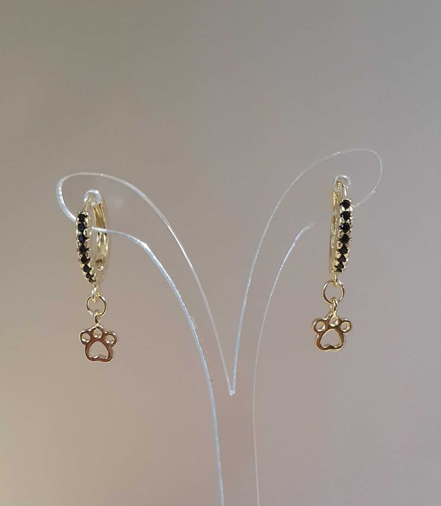 Pendientes tipo areta con huellas de mascota en plata dorada con circonitas negras en la areta y unas huellas de mascota colgando.