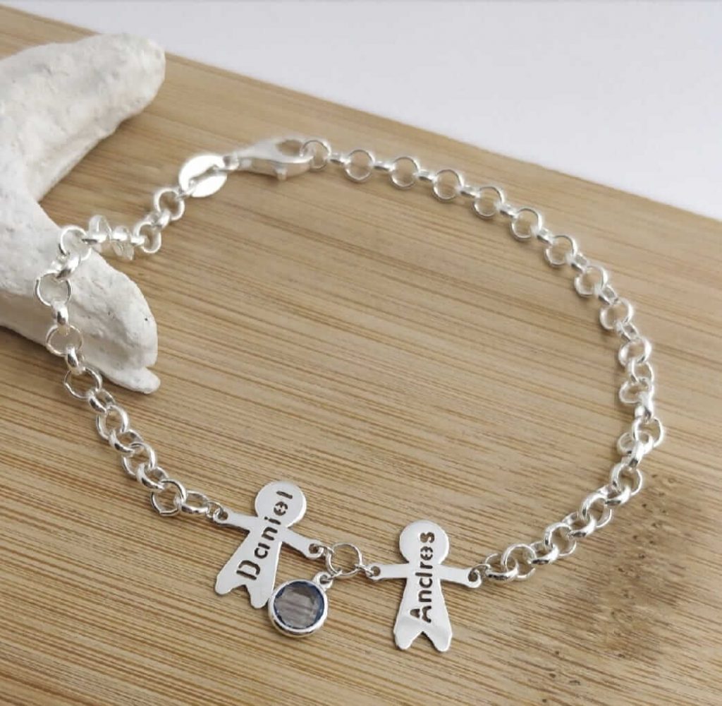 Pulsera de plata personalizada con dos niños y sus nombres y una piedra. Se podría hacer con menos o más niños pero para eso debería consultarnos. El envío tardaría unos 10 días.