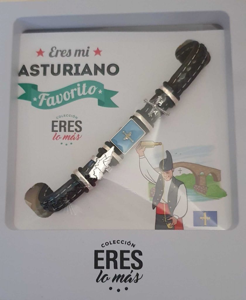 Pulsera para hombre de Promojoya al mejor Asturiano. Es de piel con los abalorios en plata y el cierre en acero. Lleva la bandera de Asturias, el mapa de Asturias y la cruz de la Victoria.