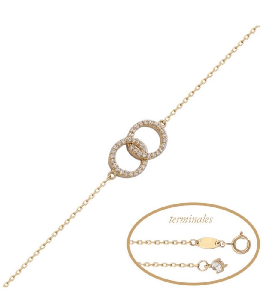 Pulsera de oro con alianzas entrelazadas en oro de 18 Kl con circonitas. La terminación es en brillo. El ancho del motivo es de 9mm y el largo de la pulsera de 20cm con opción de colocarla a 19 o 17 cm