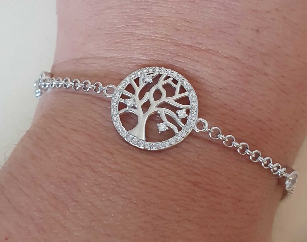 Pulsera de plata de Promojoya con el árbol de la vida en círculo con circonitas, la cadena es de rolo y lleva dos chatones con circonitas.