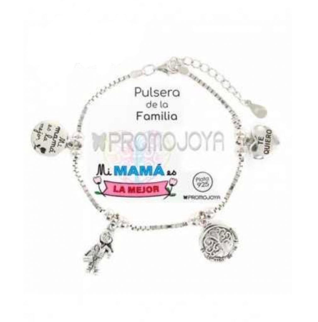 Pulsera de promojoya dedicada a la familia, especialmente a la mejor mamá. Los abalorios son de plata y el llavero de piel