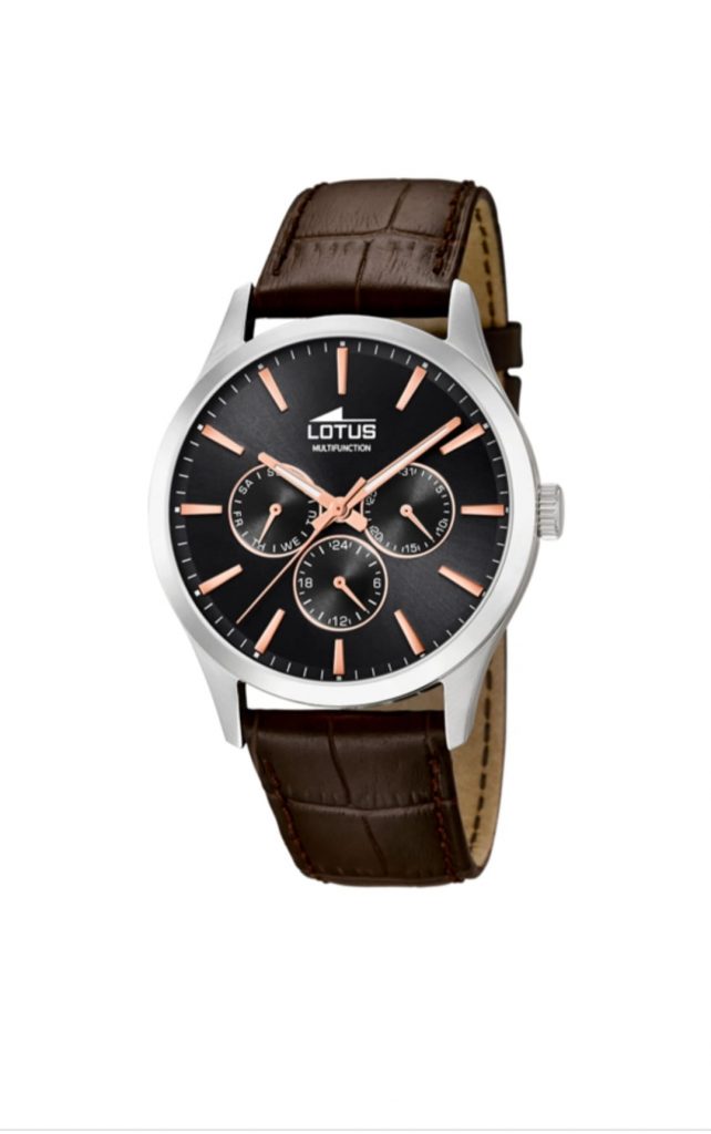 Reloj Lotus Minimalist de caballero 18576/7 tiene caja de acero, cristal mineral y correa de piel. La caja es redonda y el diámetro es de 42 mm. El color de la esfera es negro y el color de la correa es marrón. Es un reloj analógico con multifunción. La resistencia al agua es de 5 atm.