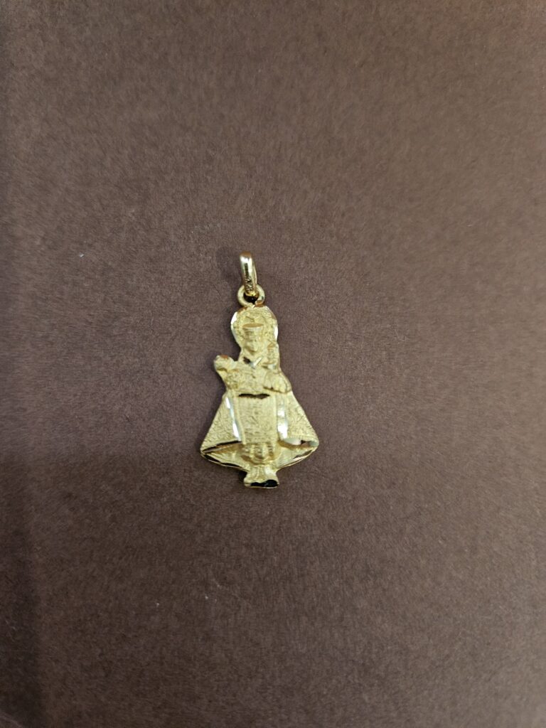 Silueta de la Virgen de Covadonga en oro de 18 kt con unas medidas aproximadas de 26 mm de alto y 15 mm de ancho