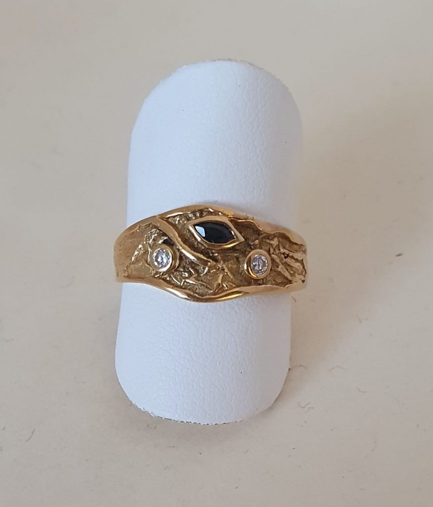 Sortija de oro amarillo labrada cyma hace 4 años Sortija de oro amarillo labrada con un zafiro y dos circonitas. Talla 17 tatum