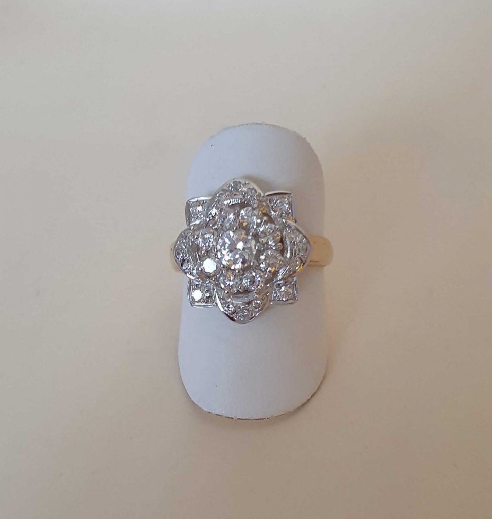 Sortija de oro amarillo y blanco con circonitas. Una preciosa sortija con un rosetón de oro blanco con circonitas con un toque vintage. Es del número 18