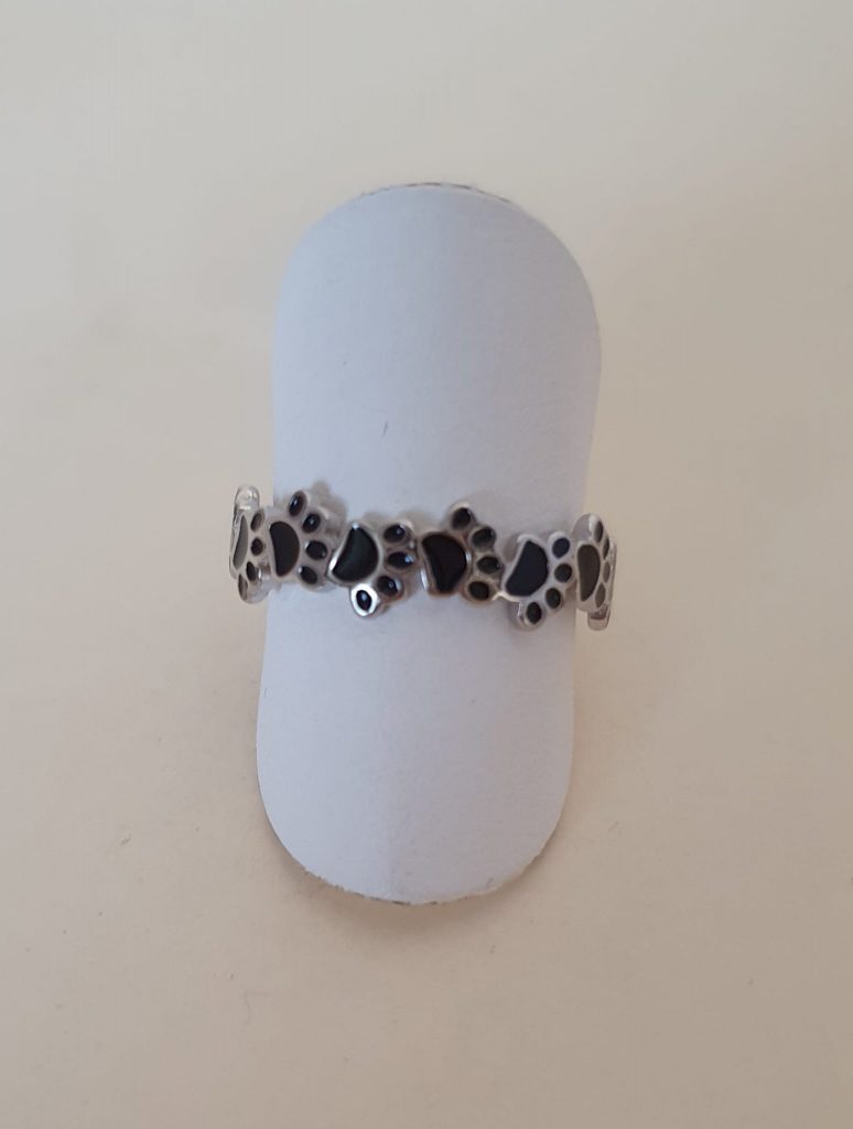 Sortija de plata de Promojoya con huellas esmaltadas en negro. Es una sortija abierta así que el número puede ir más o menos desde el 14 hasta el 18. Se puede cerrar o abrir suavemente según se necesite.