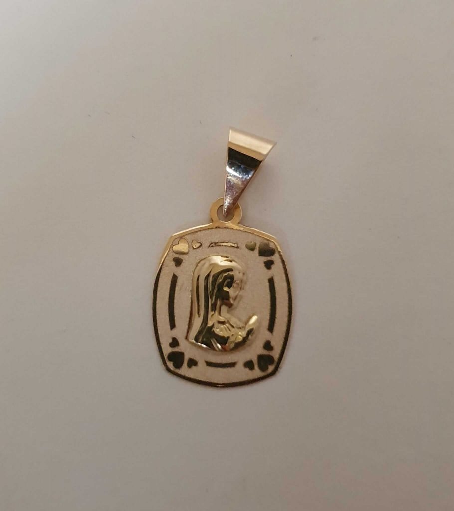 Virgen niña de oro cyma hace 5 años Virgen niña rectangular de oro con corazones alrededor de la virgen.